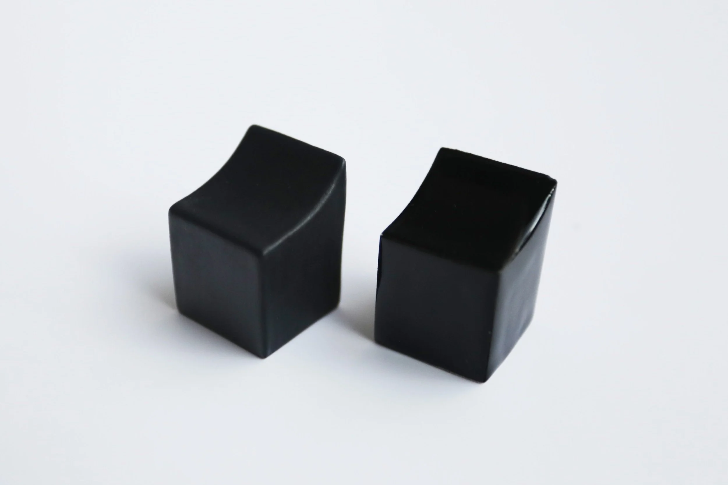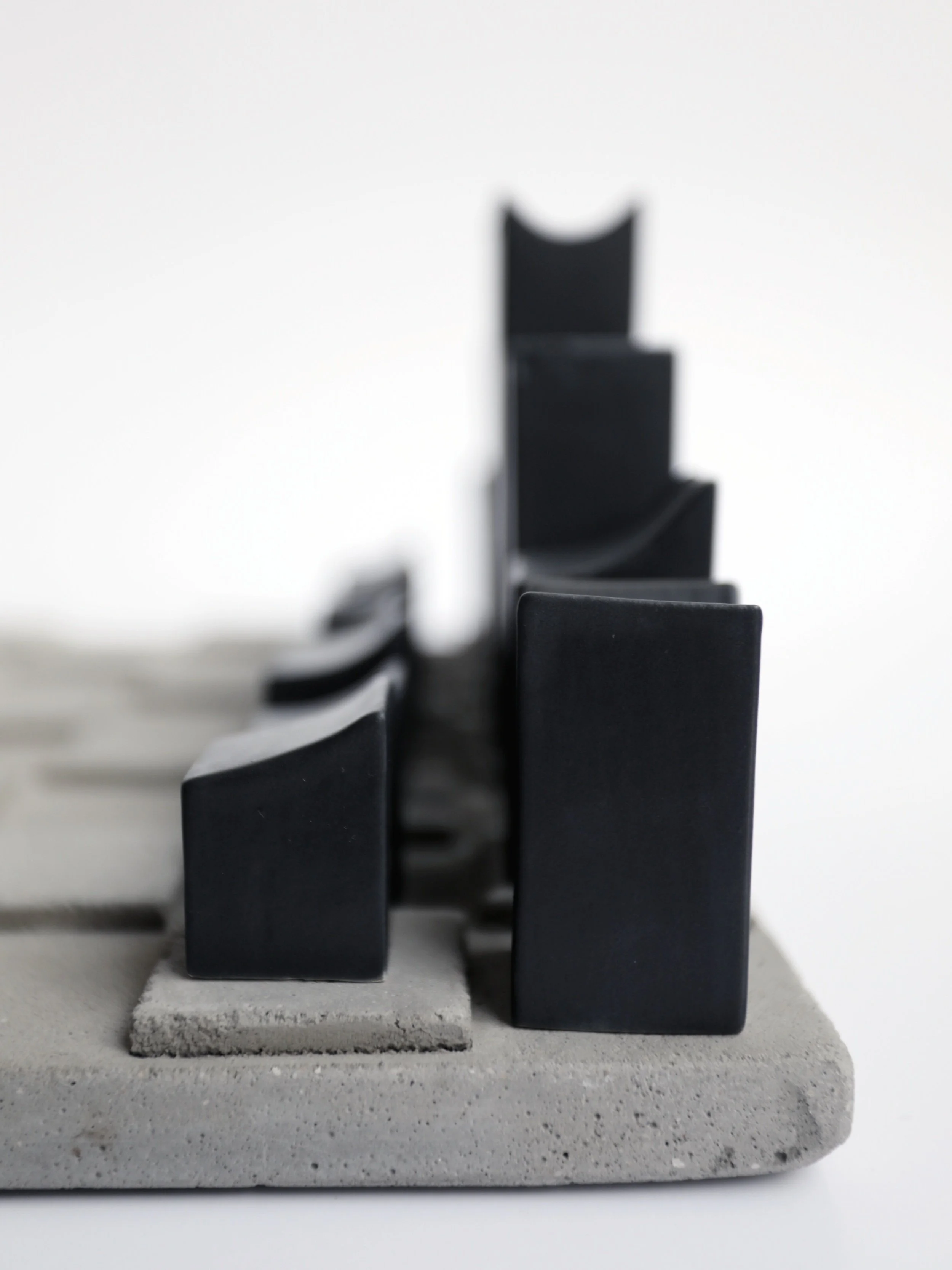 The set is made from ceramic, chosen for its weight, tactile presence, and sense of permanence. Two contrasting finishes—matte and glossy black—distinguish the sides while maintaining a unified aesthetic.